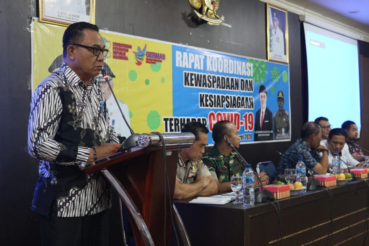 BATULICIN – Dalam upaya kesiapsiagaan terhadap penyebaran penyakit infeksi Novel Coronavirus (2019-nCoV) atau Covid-19, Pemerintah Kabupaten Tanah Bumbu (Pemkab Tanbu) menggelar Rapat koordinasi kewaspadaan dan kesiapsiagaan terhadap Covid-19, Jumat (06/03/2020) bertempat di Kantor Bupati Tanbu di Gunung Tinggi, Batulicin.