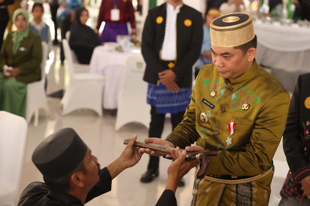 Komunitas Bugis Mantra Bumi juga menyerahkan senjata pusaka keris Tappi Lamba Pitu La Tenri Beta kepada Bang Arul, menambah kesan sakral pada momen tersebut.