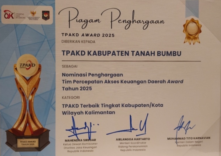 BATULICIN – Pemerintah Kabupaten Tanah Bumbu kembali menorehkan prestasi di tingkat nasional. Dalam ajang Rapat Koordinasi Nasional Tim Percepatan Akses Keuangan Daerah (Rakornas TPAKD) 2025, Pemkab Tanah Bumbu menerima Penghargaan TPAKD terbaik Tingkat Kabupaten/Kota Wilayah Kalimantan. Penghargaan diberikan atas komitmennya dalam memperluas inklusi keuangan di daerah.